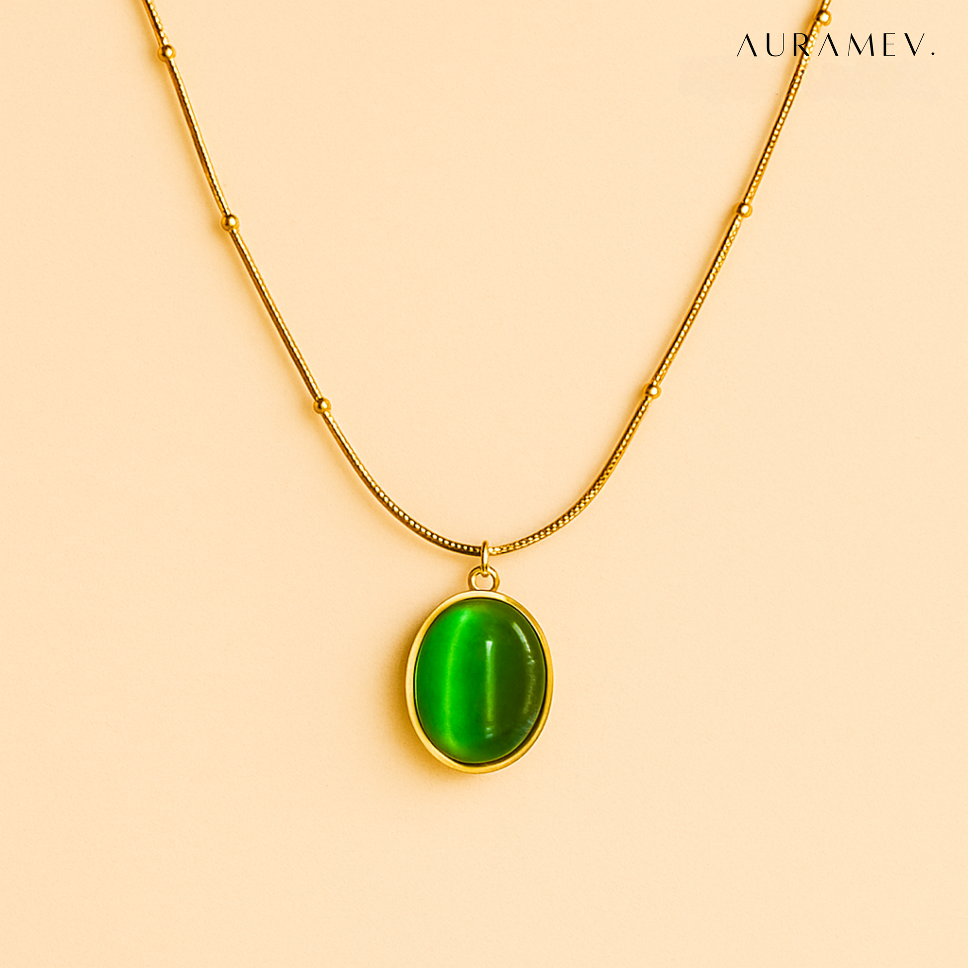 Like a forest kissed by morning mist, the Emerald Gaze Pendant Necklace brings a breath of fresh elegance to your neckline. Its timeless green hue and minimalist design make it a versatile choice. Wear it solo for subtle sophistication or layer it with gold chains for a more styled statement.