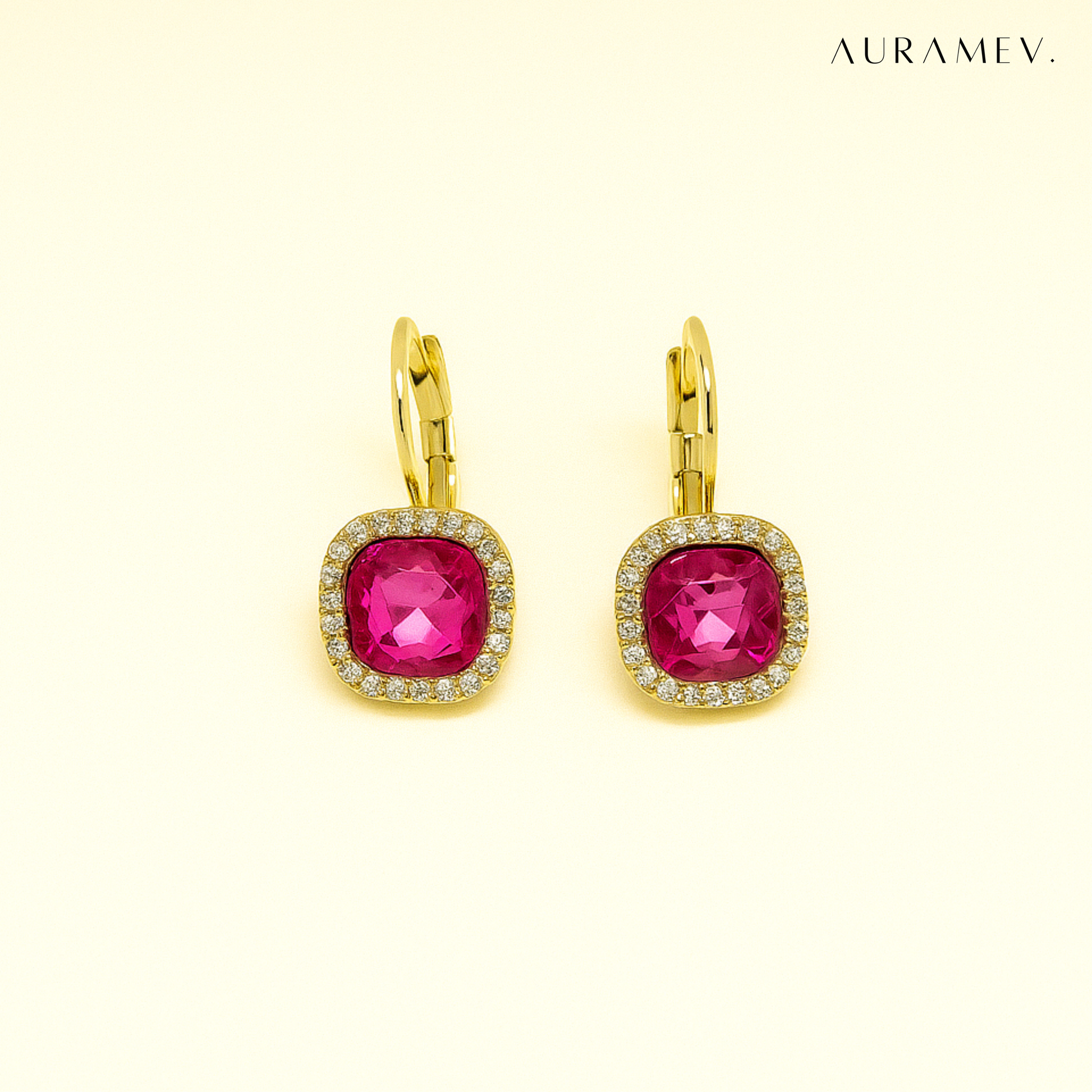 - Cushion-cut pink faux gemstone surrounded by shimmering micro stones