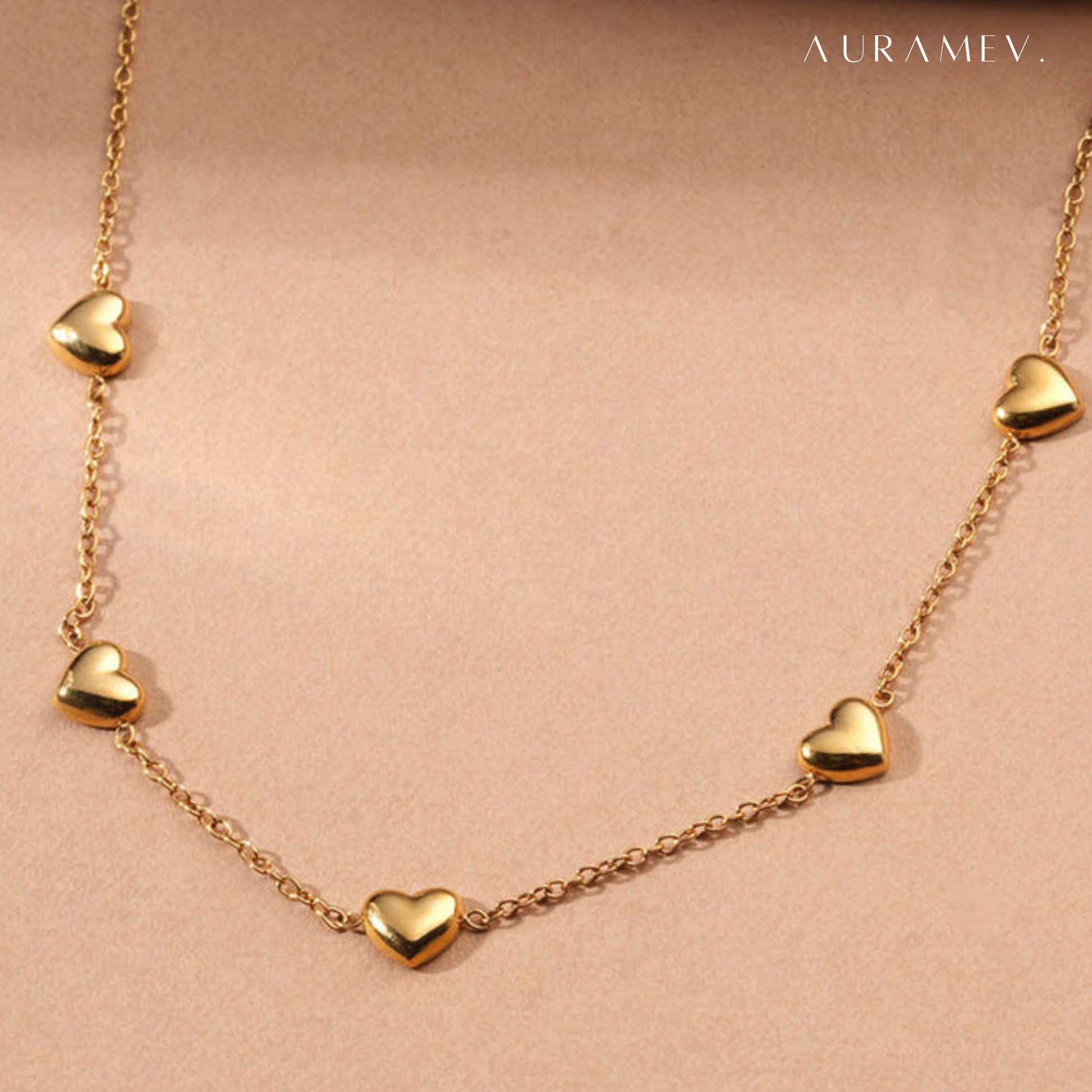 The Mini Hearts Necklace is a subtle nod to romance and playfulness. Scattered with tiny heart-shaped charms on a sleek gold-toned chain, it’s light, minimal, and effortlessly cute. Whether you're dressing up or down, this piece adds a golden touch of affection to any outfit.