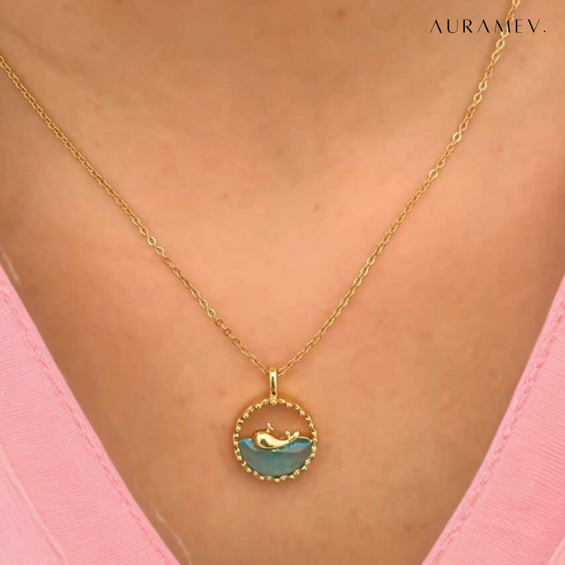 Let your style drift into calm waters with the Ocean Dream Whale Pendant Necklace. Featuring a serene whale charm gliding through dreamy ocean-toned enamel, this necklace evokes peace, freedom, and quiet luxury. The round charm is delicately framed in rich gold plating, making it a soothing, minimalist statement for every day.